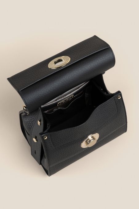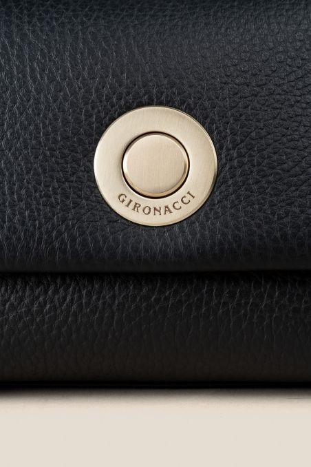 Magnetic flap closure with Gironacci logo element in light gold galvanized satin-finish metal.