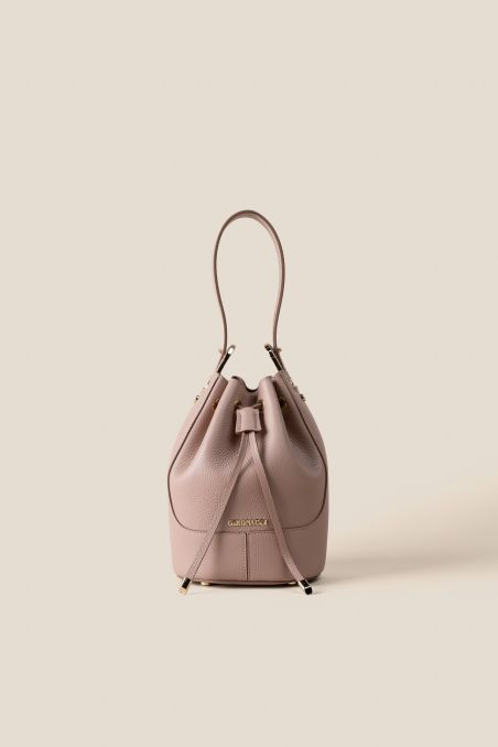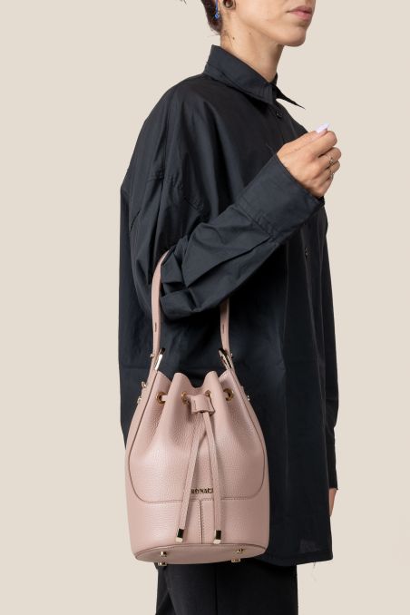 Secchiello in preziosa pelle bottalata, pratica e glamour allo stesso tempo, presenta una chiusura a sacchetto.