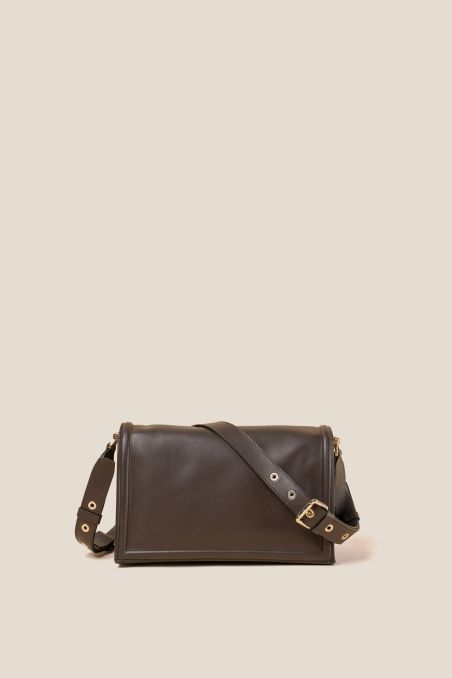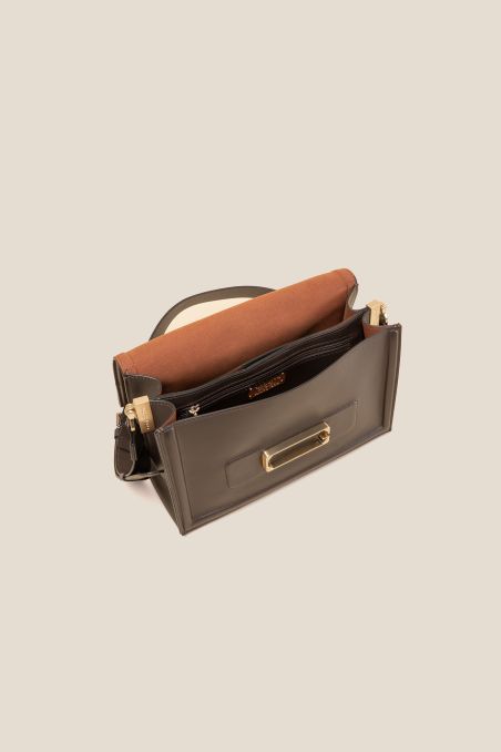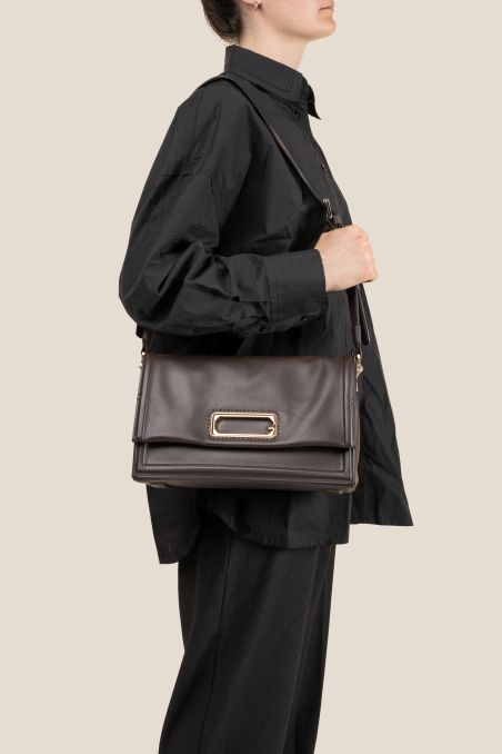 Borsa a tracolla realizzata artigianalmente in vitello pieno fiore, capiente ma dalle linee essenziali, elegante e distintiva.