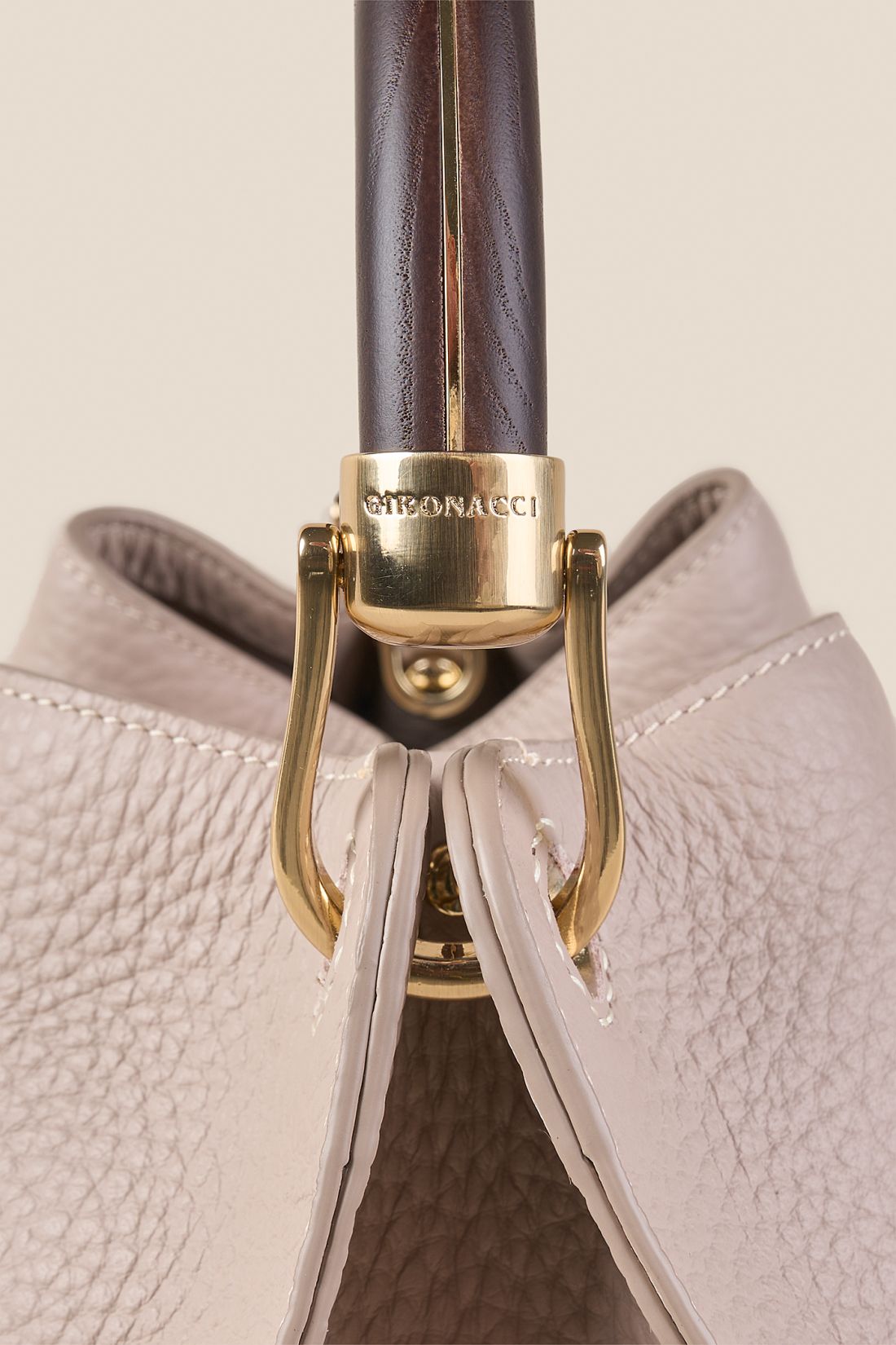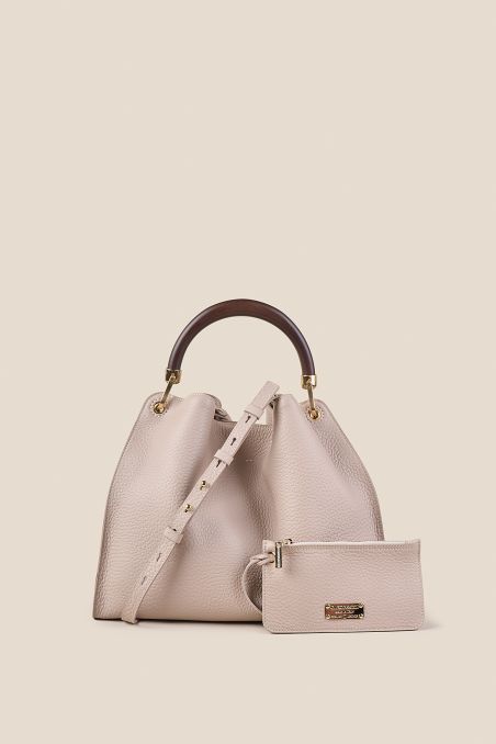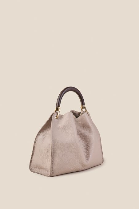 Realizzata in pregiata pelle di vitello bottalato pieno fiore, è stata selezionata per la sua mano incredibilmente morbida e la bellezza della sua grana. La silhouette capiente, dalle linee pulite, è resa inconfondibile dal manico rigido in legno naturale: un dettaglio ricercato le cui venature, sempre diverse, donano a ogni singolo modello un carattere unico.