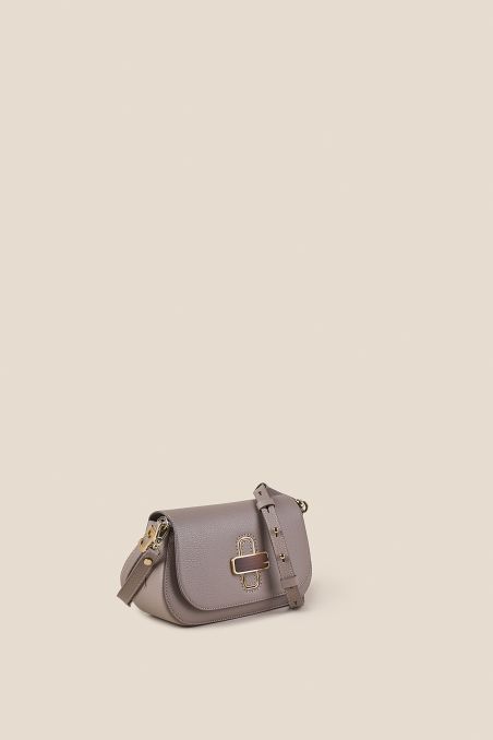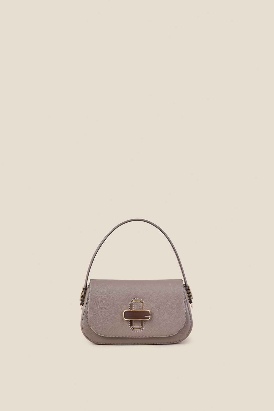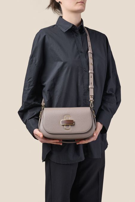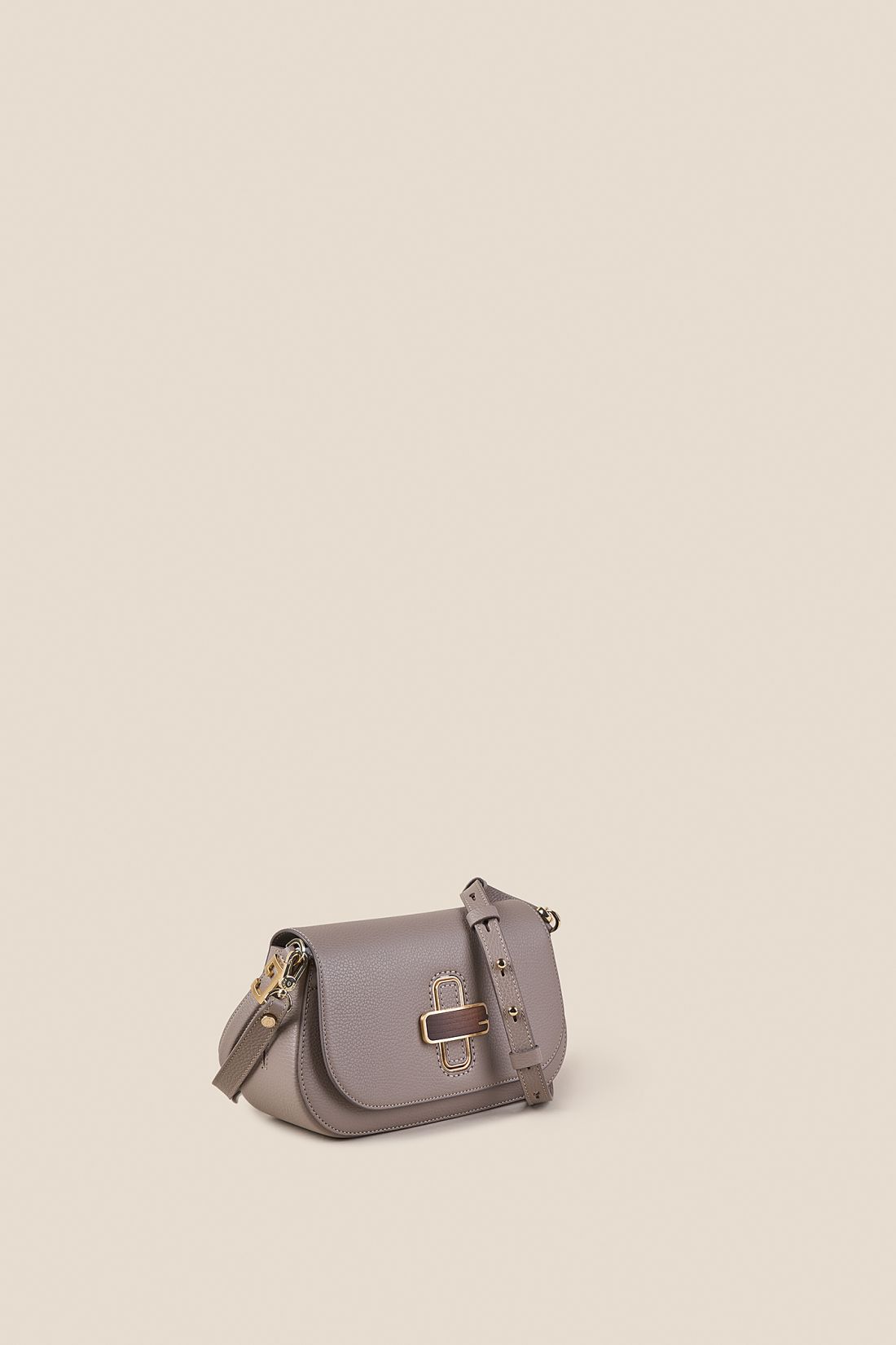 Realizzata in pregiata pelle pieno fiore italiana, si distingue per la bellezza della sua texture naturale che ne valorizza l’estetica raffinata. Il vero protagonista del modello è la chiusura frontale con meccanismo a girello, impreziosita da un esclusivo inserto in legno: un dettaglio sofisticato che dialoga in perfetta armonia con la luminosità della minuteria metallica con finitura galvanica oro.