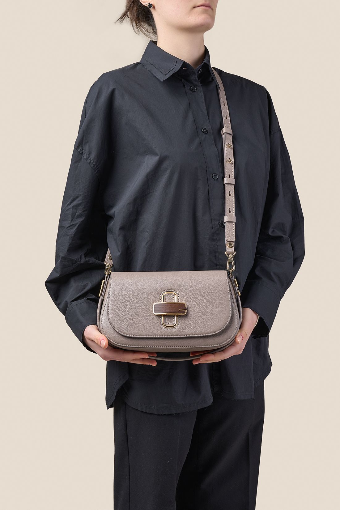 L'estetica incontra la massima funzionalità grazie a un design studiato per la versatilità. A rendere unico questo modello è il design intelligente del manico corto: dotato di un ingegnoso meccanismo a rotazione, può essere comodamente ripiegato e nascosto sotto il fondo della borsa quando si sceglie di utilizzare la tracolla lunga (regolabile e removibile). Un dettaglio tecnico di alta pelletteria che garantisce assoluta libertà di movimento crossbody e mantiene intatta la pulizia delle linee.