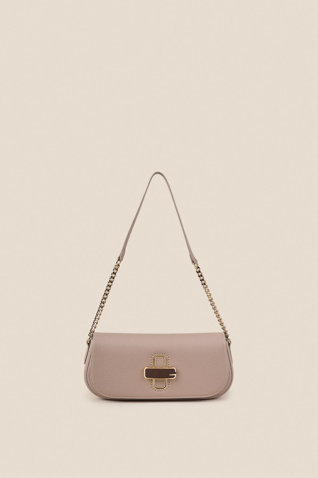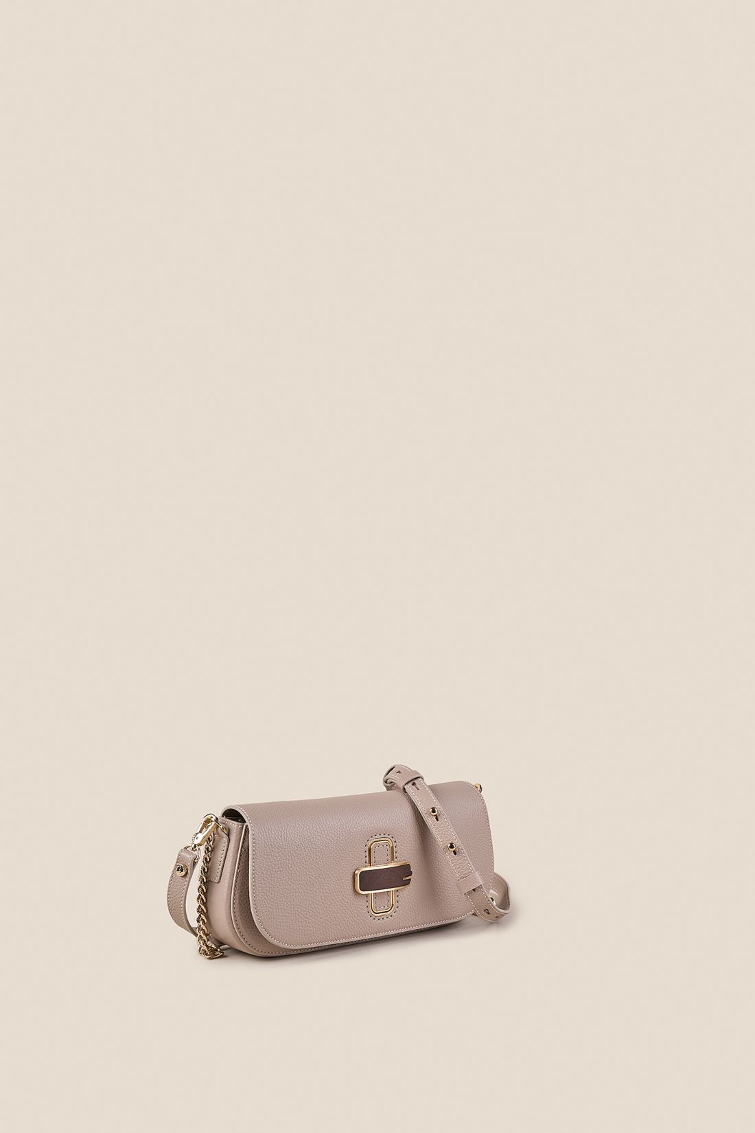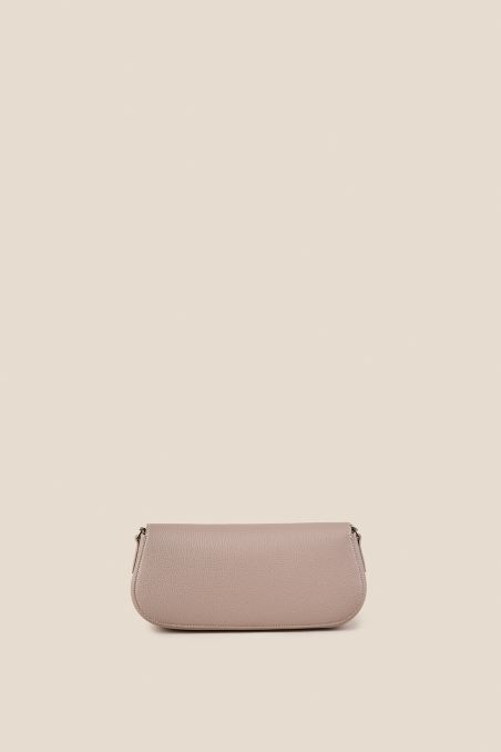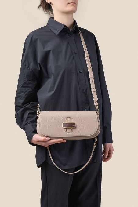 Realizzata in pregiata pelle di vitello bottalato, si distingue per la bellezza della sua texture naturale che ne valorizza l’estetica raffinata. Il vero protagonista del modello è la chiusura frontale a girello impreziosita da un esclusivo inserto in legno naturale: un dettaglio sofisticato che dialoga in perfetta armonia con la luminosità della minuteria metallica con finitura galvanica oro.