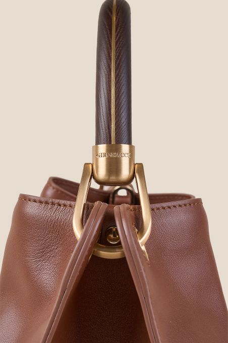 Realizzata in pregiato vitello liscio pieno fiore, è caratterizzata da una silhouette capiente dalle linee pulite, resa inconfondibile dal manico rigido in legno naturale: un dettaglio ricercato le cui venature, sempre diverse, donano a ogni singolo modello un carattere unico.