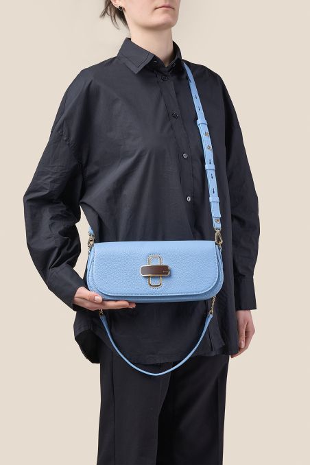 Realizzata in pregiata pelle di vitello bottalato, si distingue per la bellezza della sua texture naturale che ne valorizza l’estetica raffinata. Il vero protagonista del modello è la chiusura frontale a girello impreziosita da un esclusivo inserto in legno naturale: un dettaglio sofisticato che dialoga in perfetta armonia con la luminosità della minuteria metallica con finitura galvanica oro.