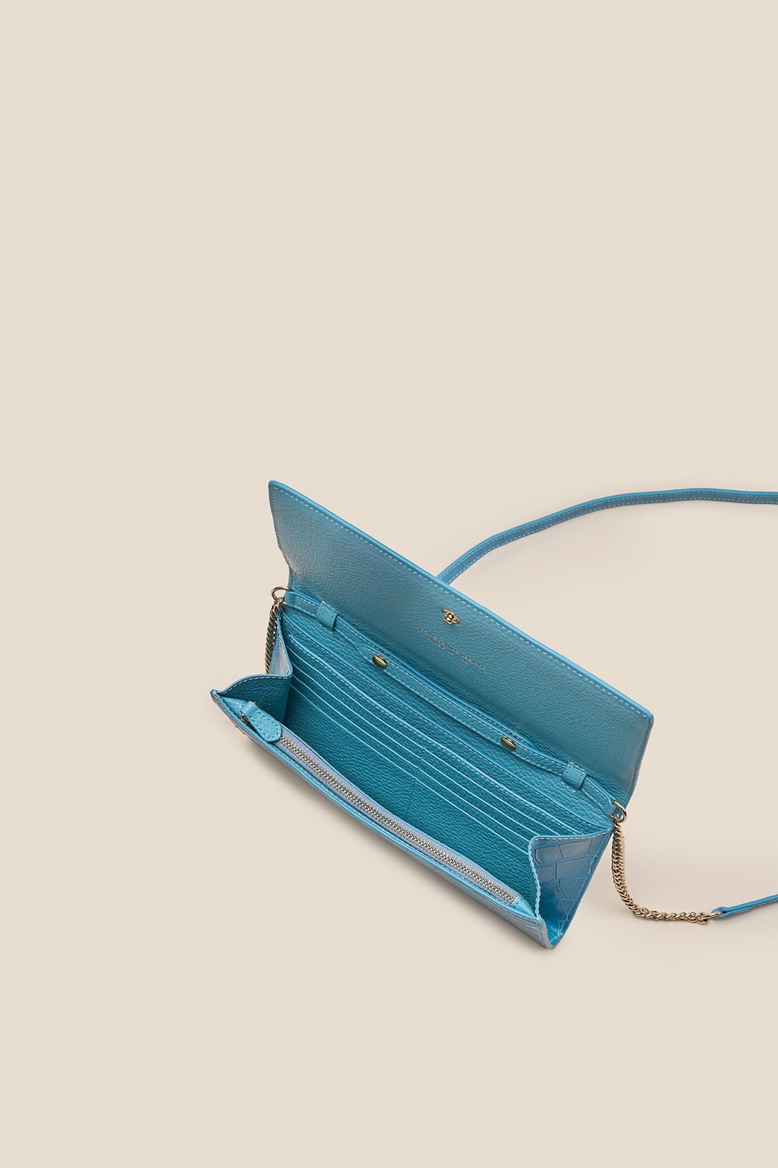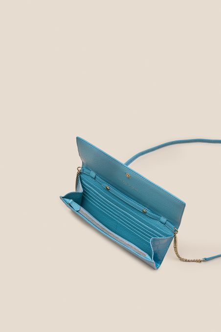 L'estetica si fonde con una praticità assoluta. La sottile tracolla in pelle, arricchita da eleganti dettagli in catena, ti permette di indossarlo comodamente a spalla o crossbody. La chiusura a patta svela un interno progettato per la massima organizzazione: un vero e proprio layout da portafoglio che rende superfluo l'uso di accessori aggiuntivi, unendo funzionalità e stile in un unico, impeccabile accessorio.